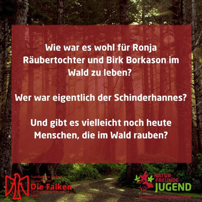 Zusammen mit der Naturfreundejugend RLP fahren wir auf Herbstfreizeit. Und zwar geht es unter dem Motto Räuber auf Spurensuche in den Taunus. Vom 15. bis zum 20.10 fahren wir in das Naturfreundehaus Wiesbaden.